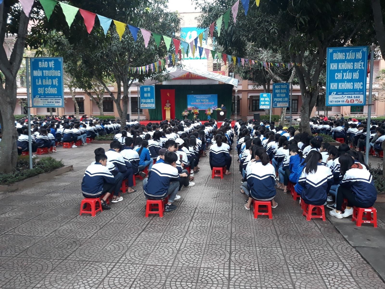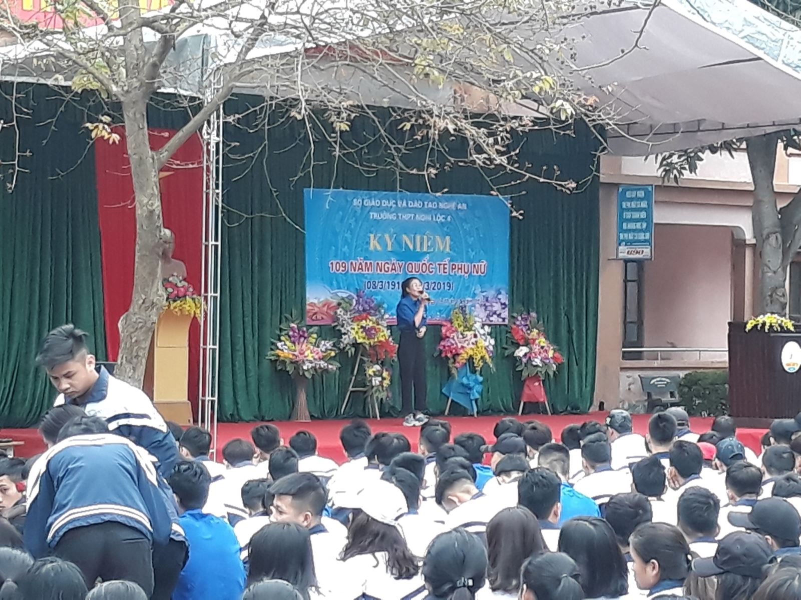 Cô giáo Hoàng Thị Thu Thủy – Trưởng ban Nữ Công giới thiệu về lịch sử ra đời ngày Quốc tế phụ nữ 8/3. Buổi kỷ niệm diễn ra trong niềm vui của tất cả CB, GV, NV và gần 1200 học sinh toàn trường. Tại buổi kỷ niệm đội văn nghệ của Công đoàn, Đoàn trường tham gia biểu diễn chức mừng Nữ CB, GV, NV và nữ học sinh toàn trường.
