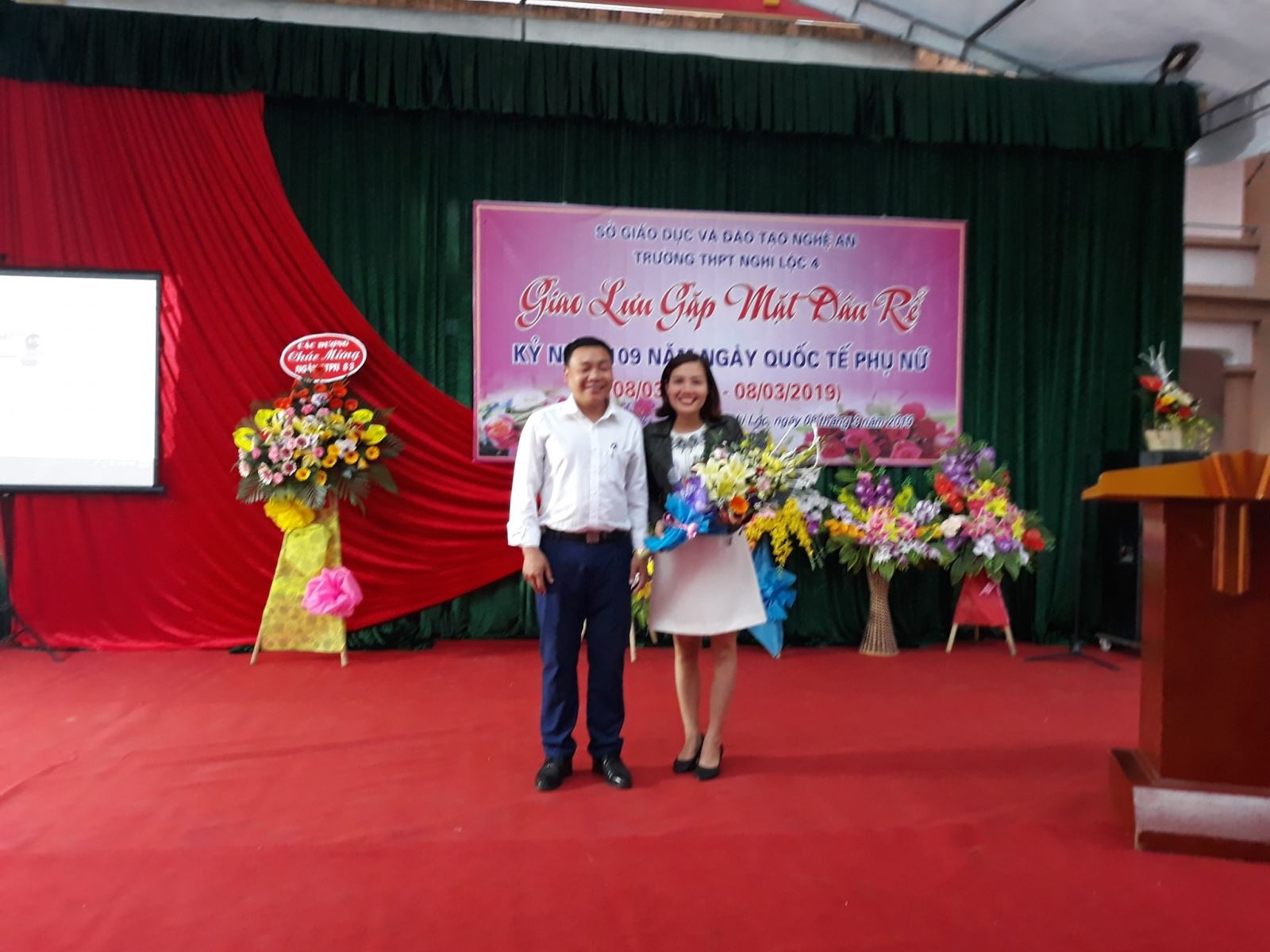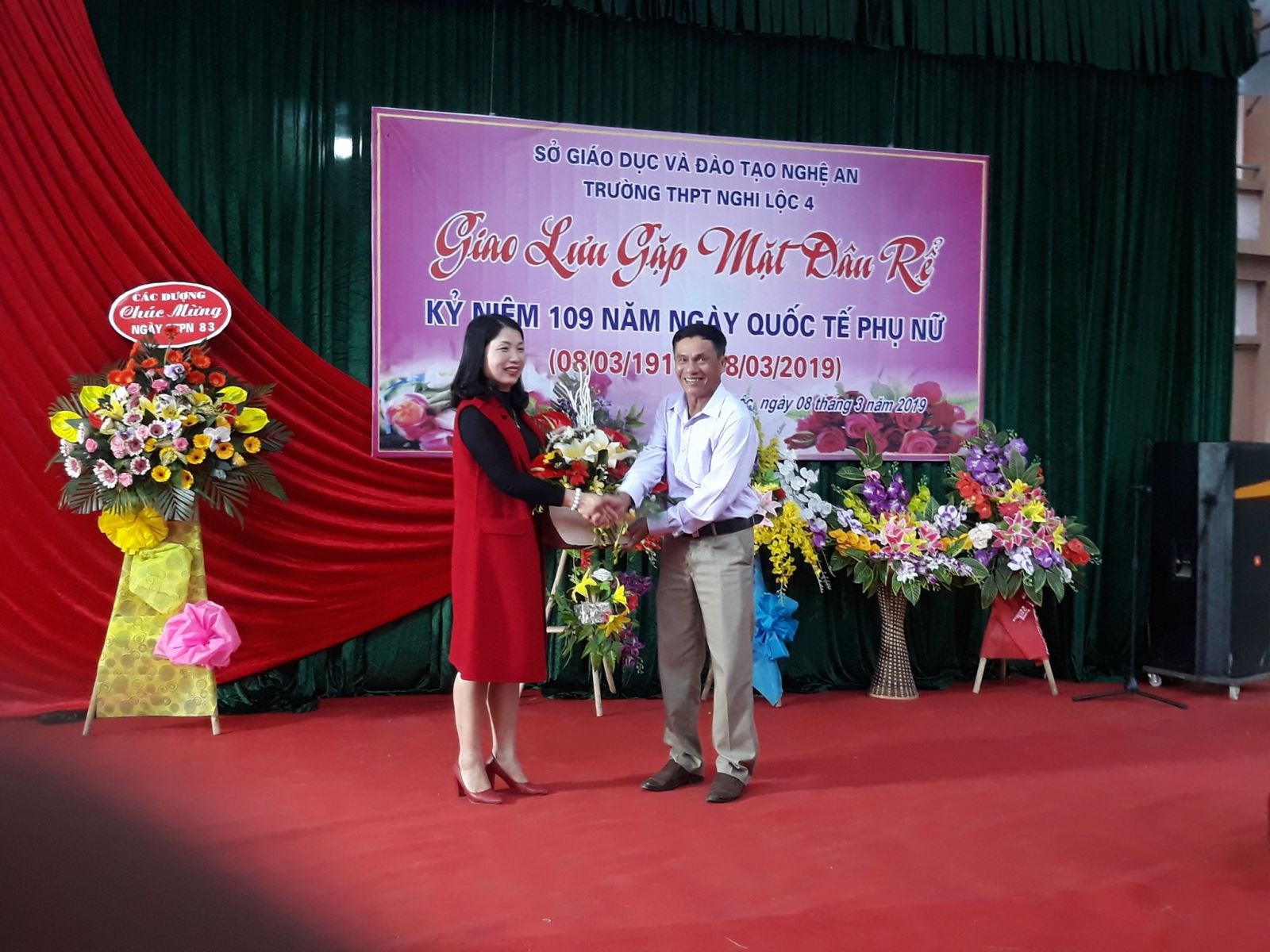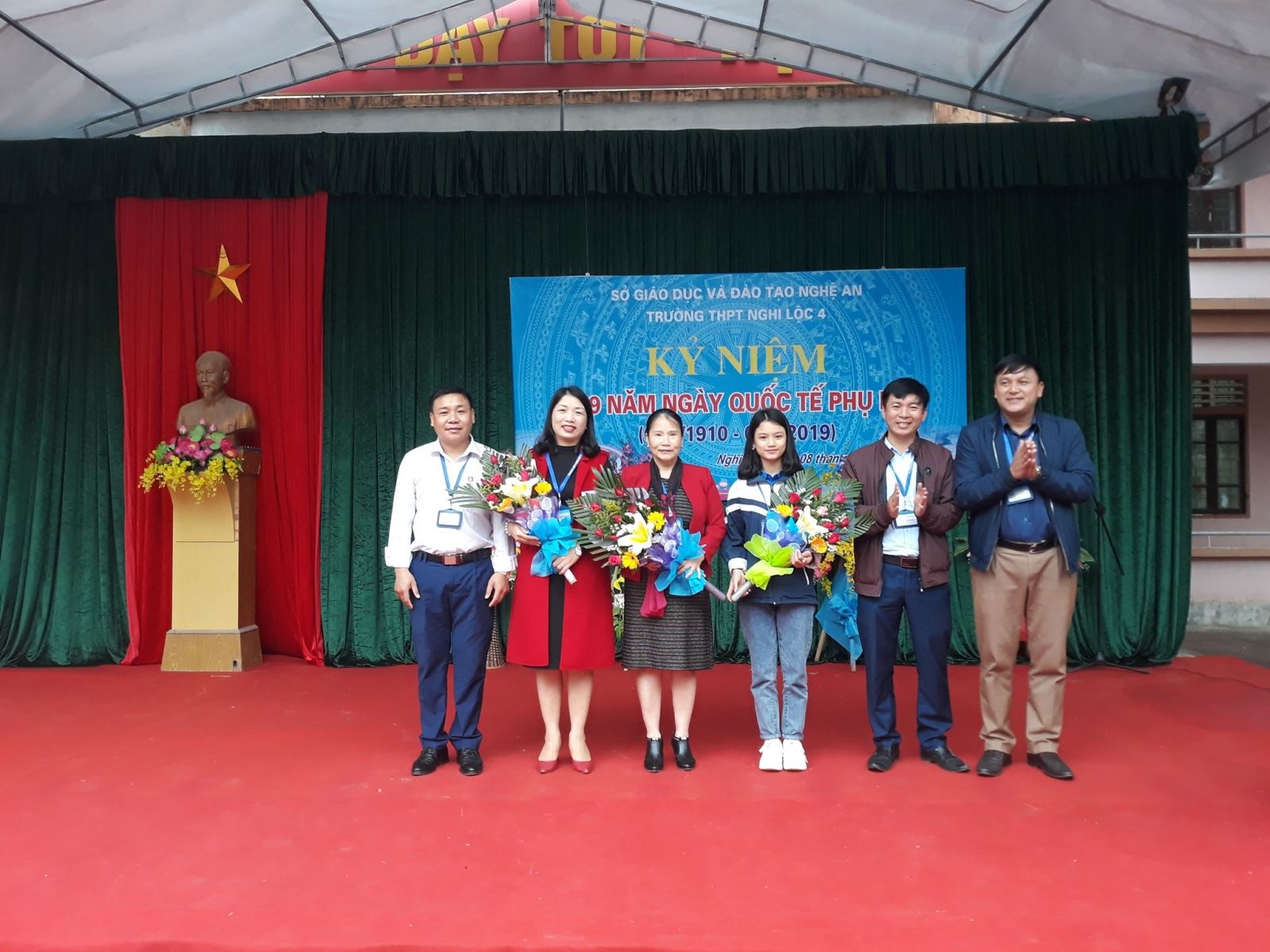 Đại diện BGH, Công đoàn, Đoàn trường tặng hoa chức mừng đại diện Nữ CB, GV, NV và nữ học sinh nhân kỷ niệm 109 năm ngày Quốc tế phụ nữ.