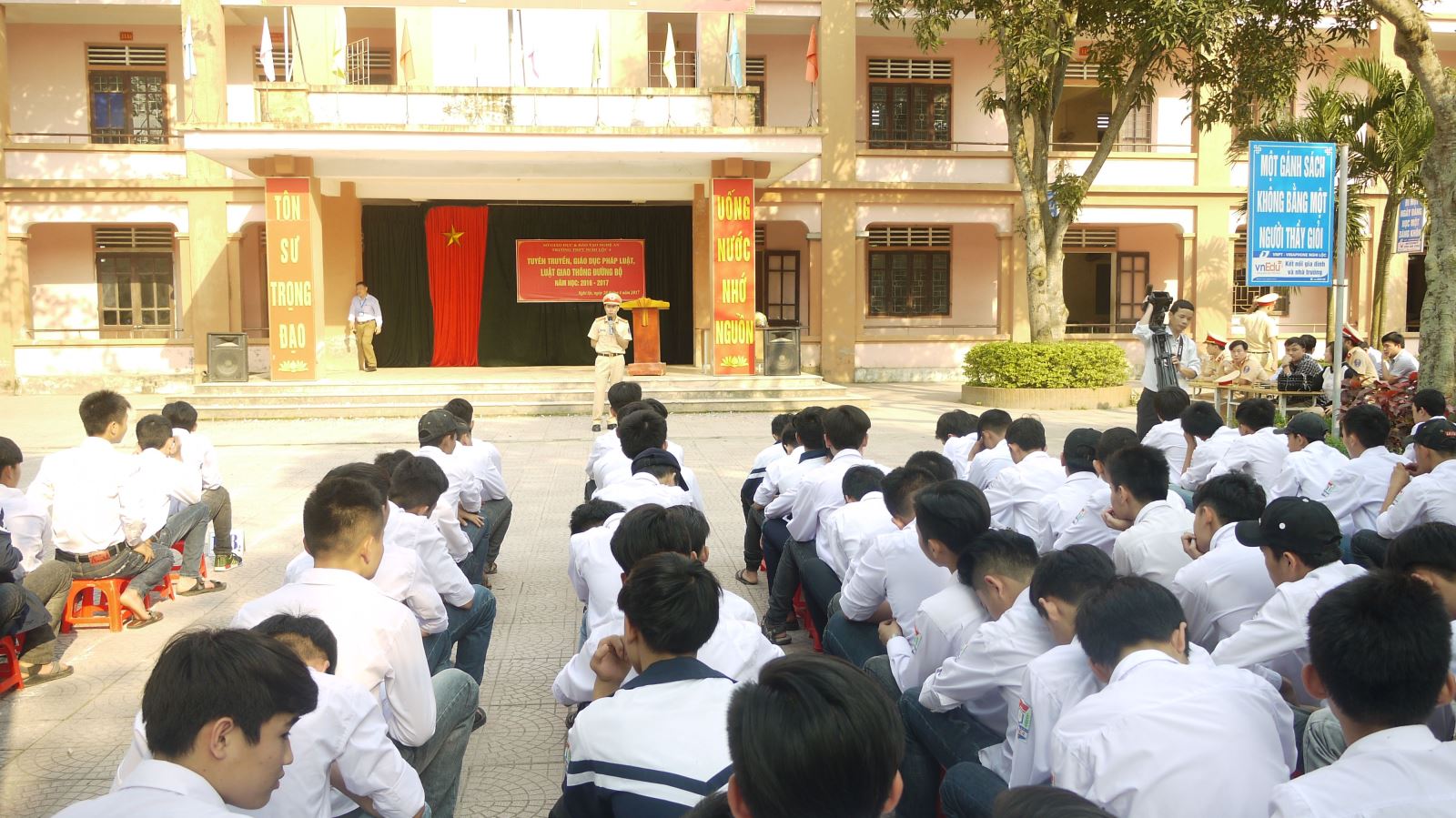 Được sự nhất trí của cấp ủy, Ban giám hiệu nhà trường, hôm nay 10/04/2017 Đoàn Trường và Ban ATGT- ANTH phối hợp cùng công an Huyện Nghi Lộc tổ chức buổi Tuyên truyền giáo dục pháp luật – Luật giao thông đường bộ cho học sinh toàn trường.
