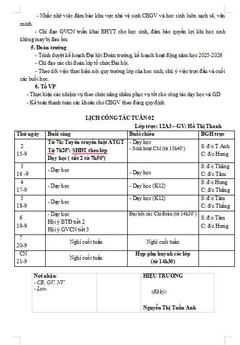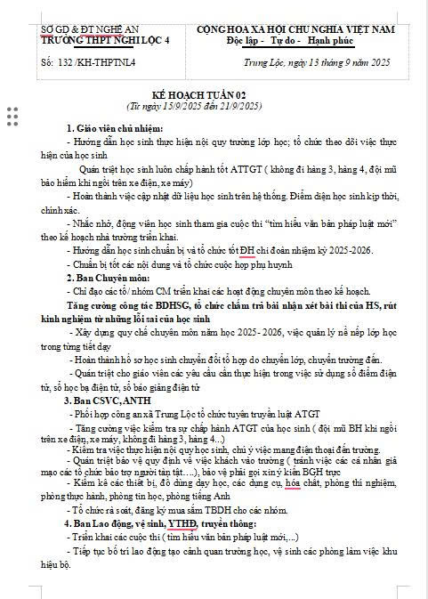 Kế hoạch công tác tuần 02 năm học 2025-2026