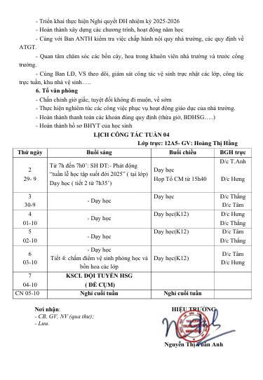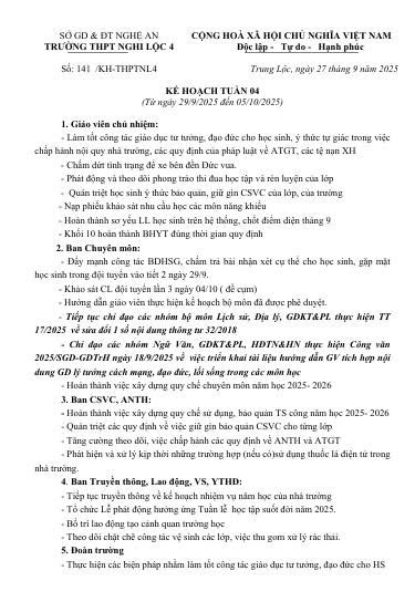 Kế hoạch công tác tuần 04 năm học 2025-2026