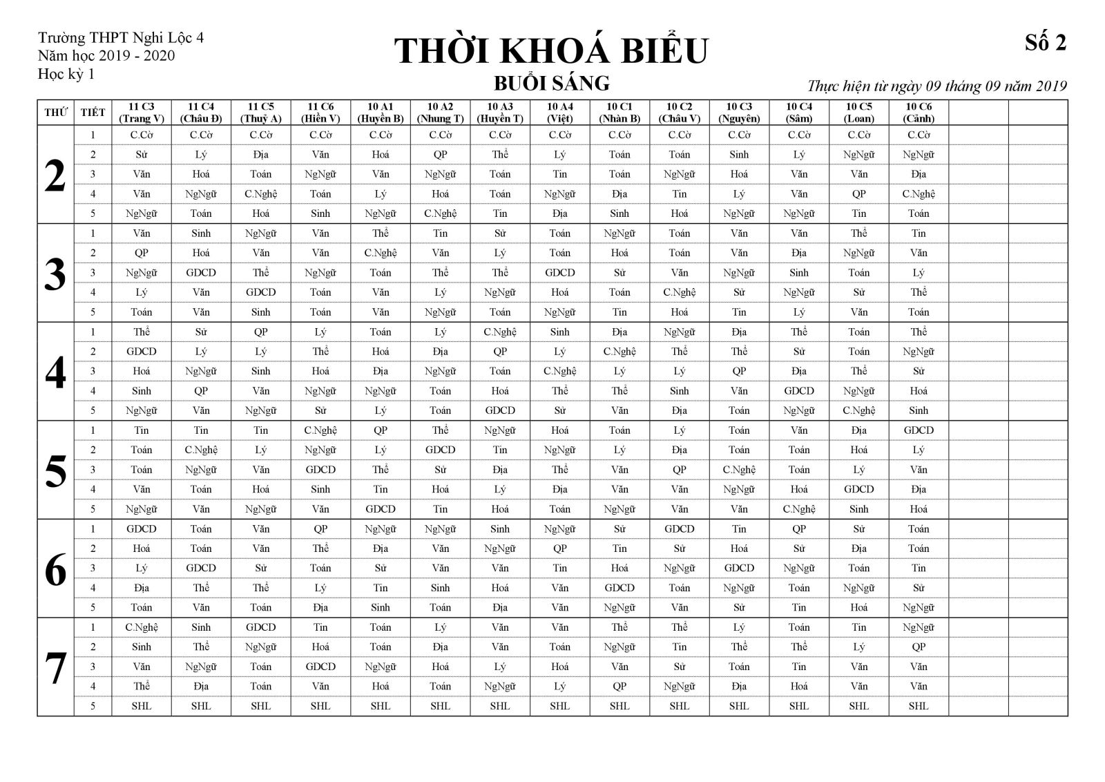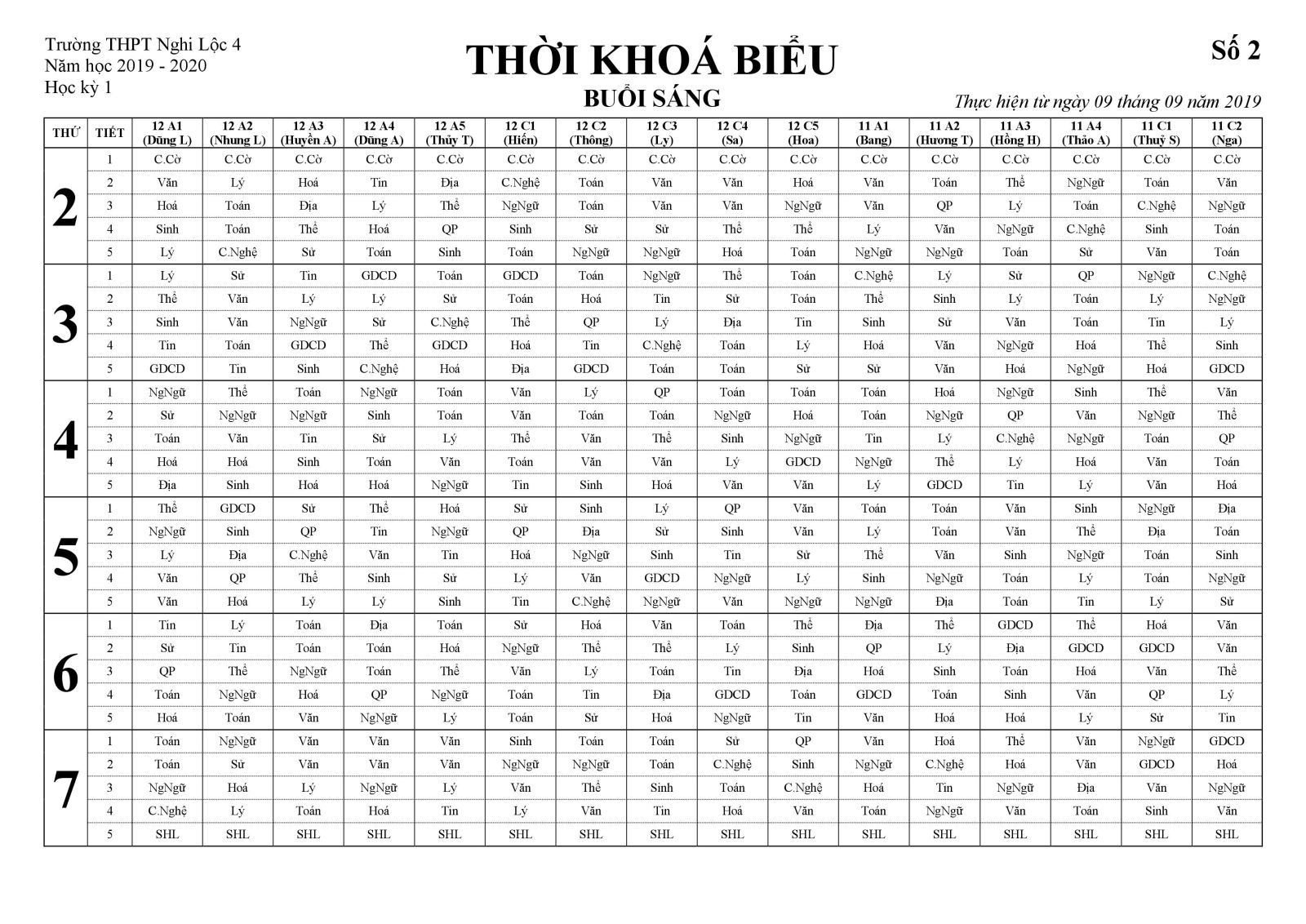 Thời khóa biểu số 2 _ Năm học 2019-2020