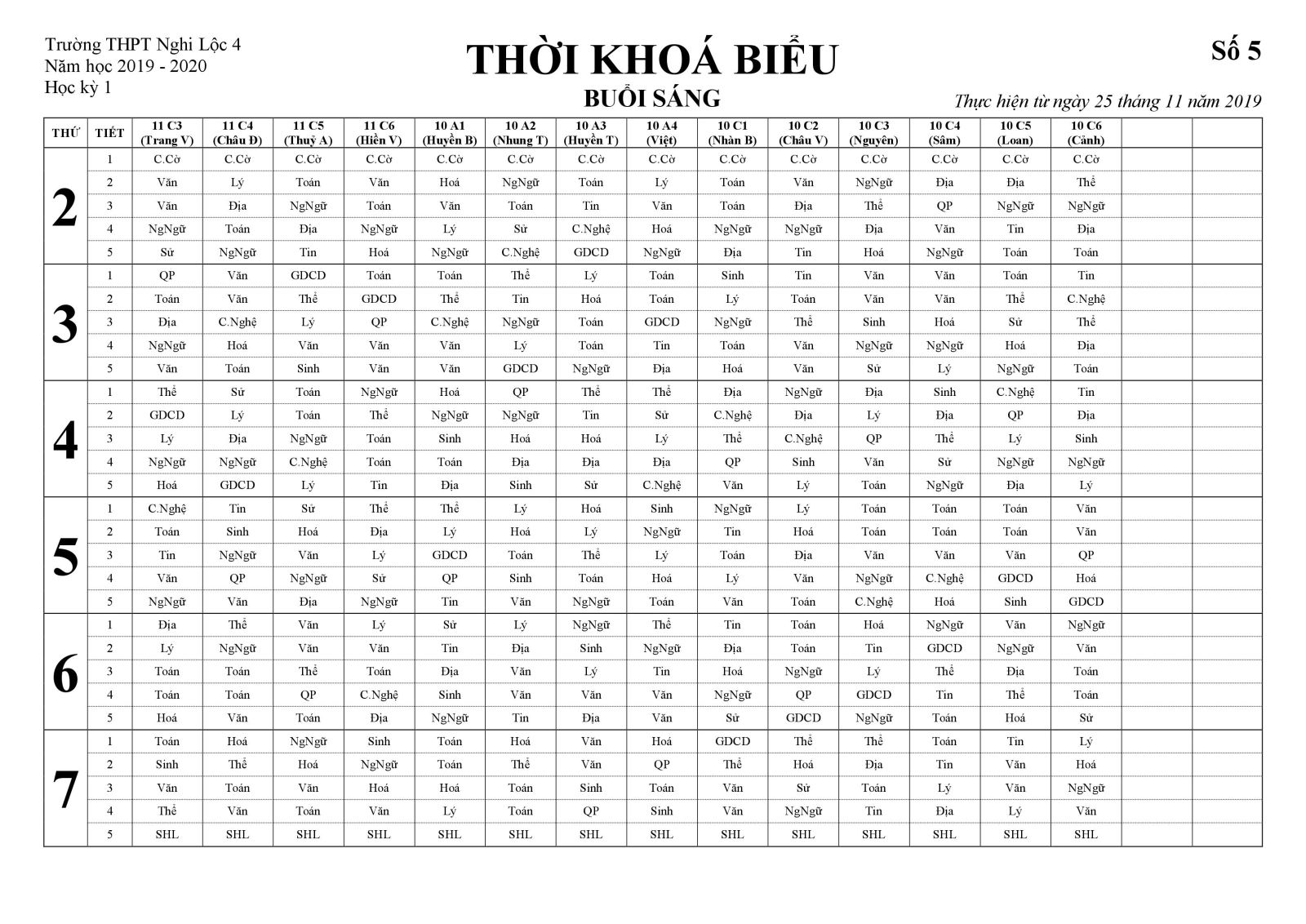 Thời khóa biểu số 5 _ Năm học 2019-2020