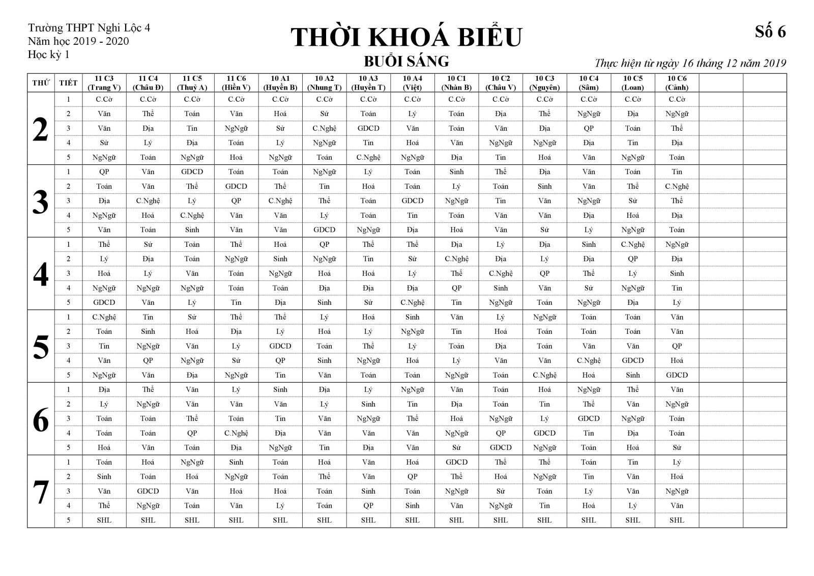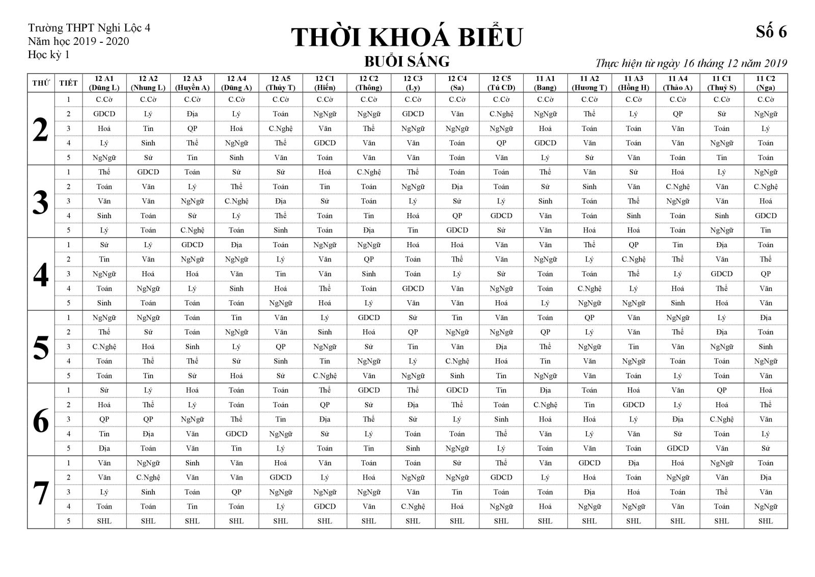 Thời khóa biểu số 6 _ Năm học 2019-2020
