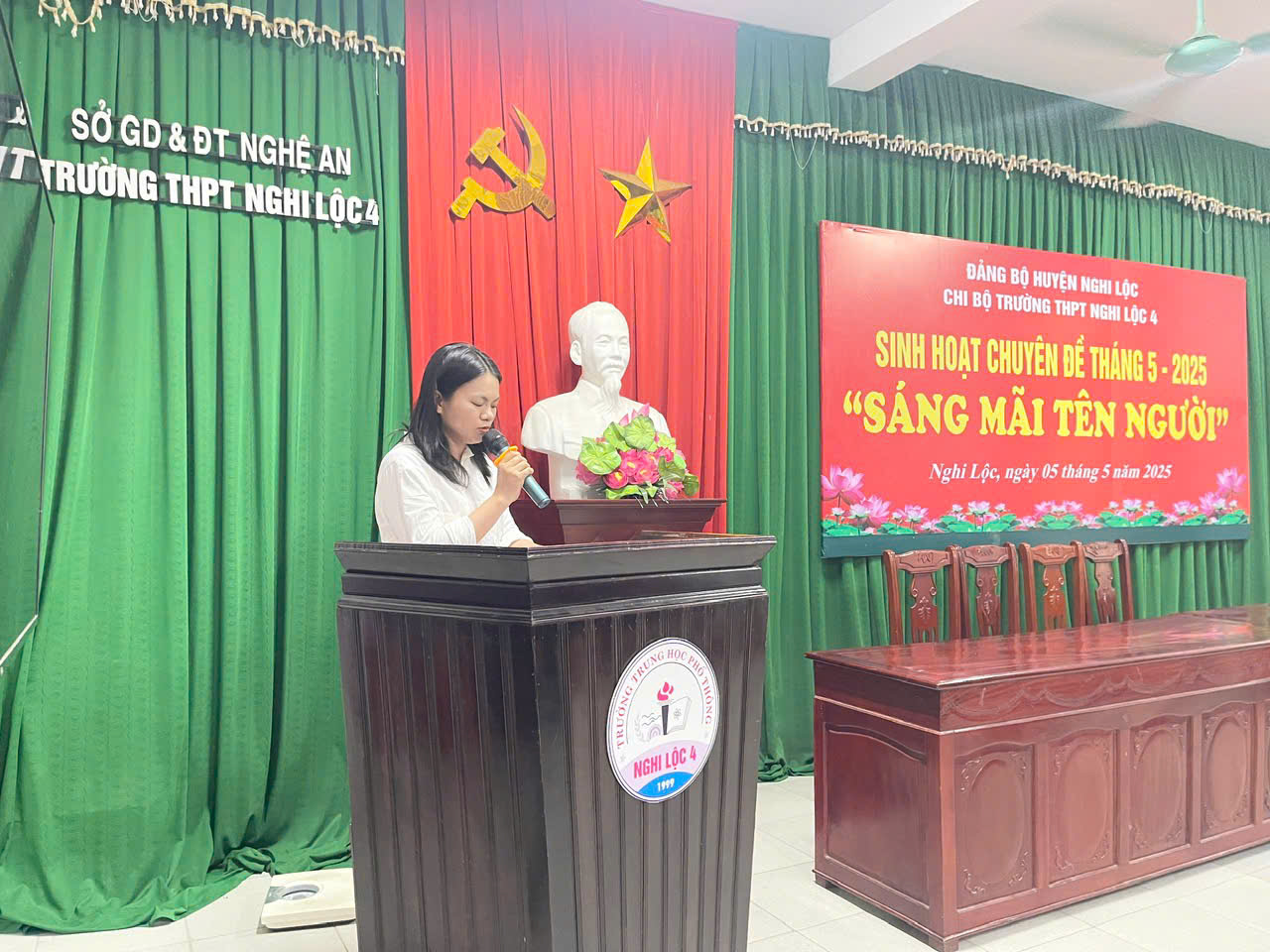 Đồng chí Dương Thị Lam - GV Ngữ Văn báo cáo sinh hoạt chuyền đề tháng 5 năm 2025 "SÁNG MÃI TÊN NGƯỜI"