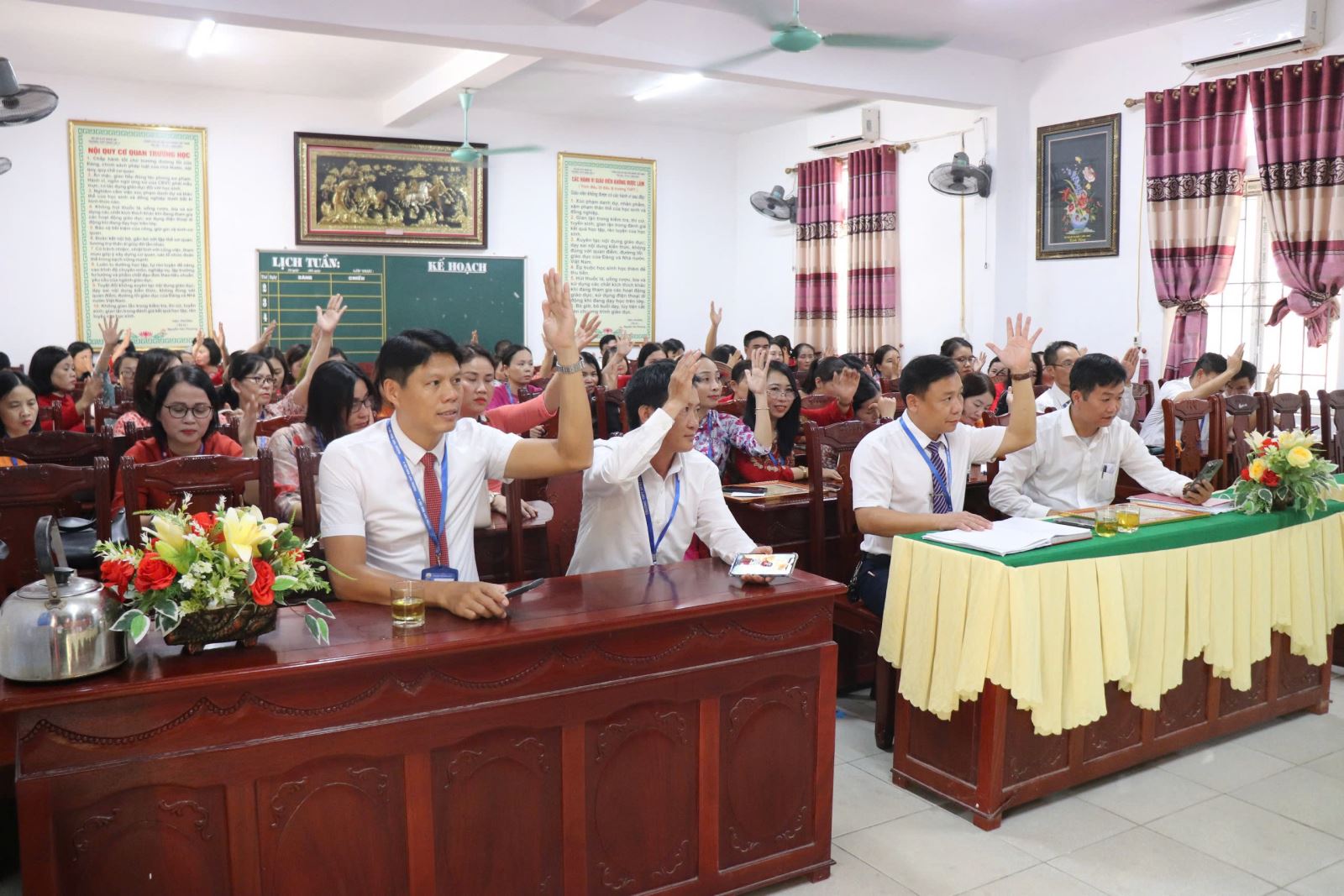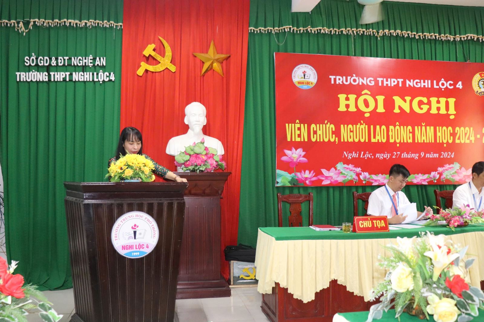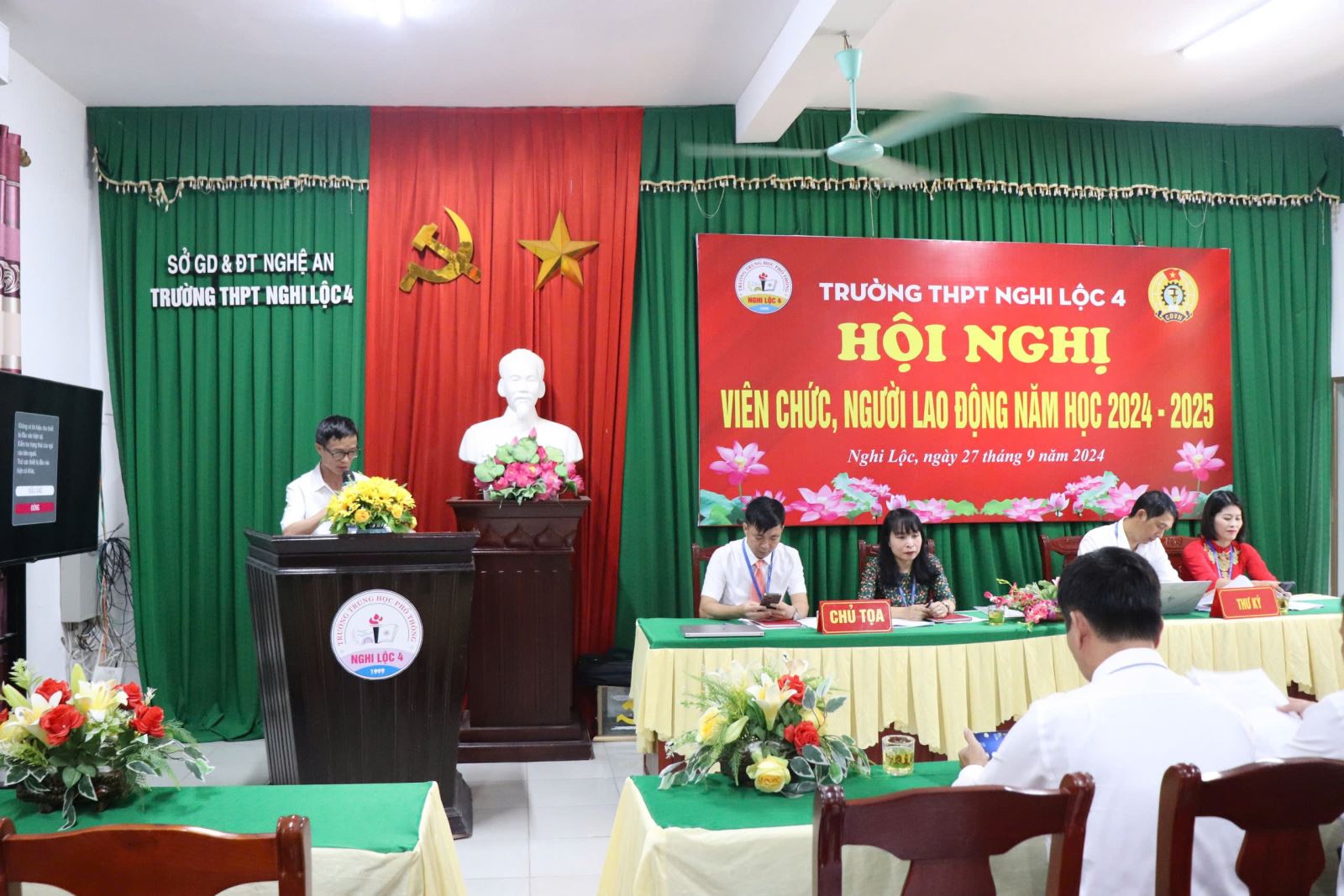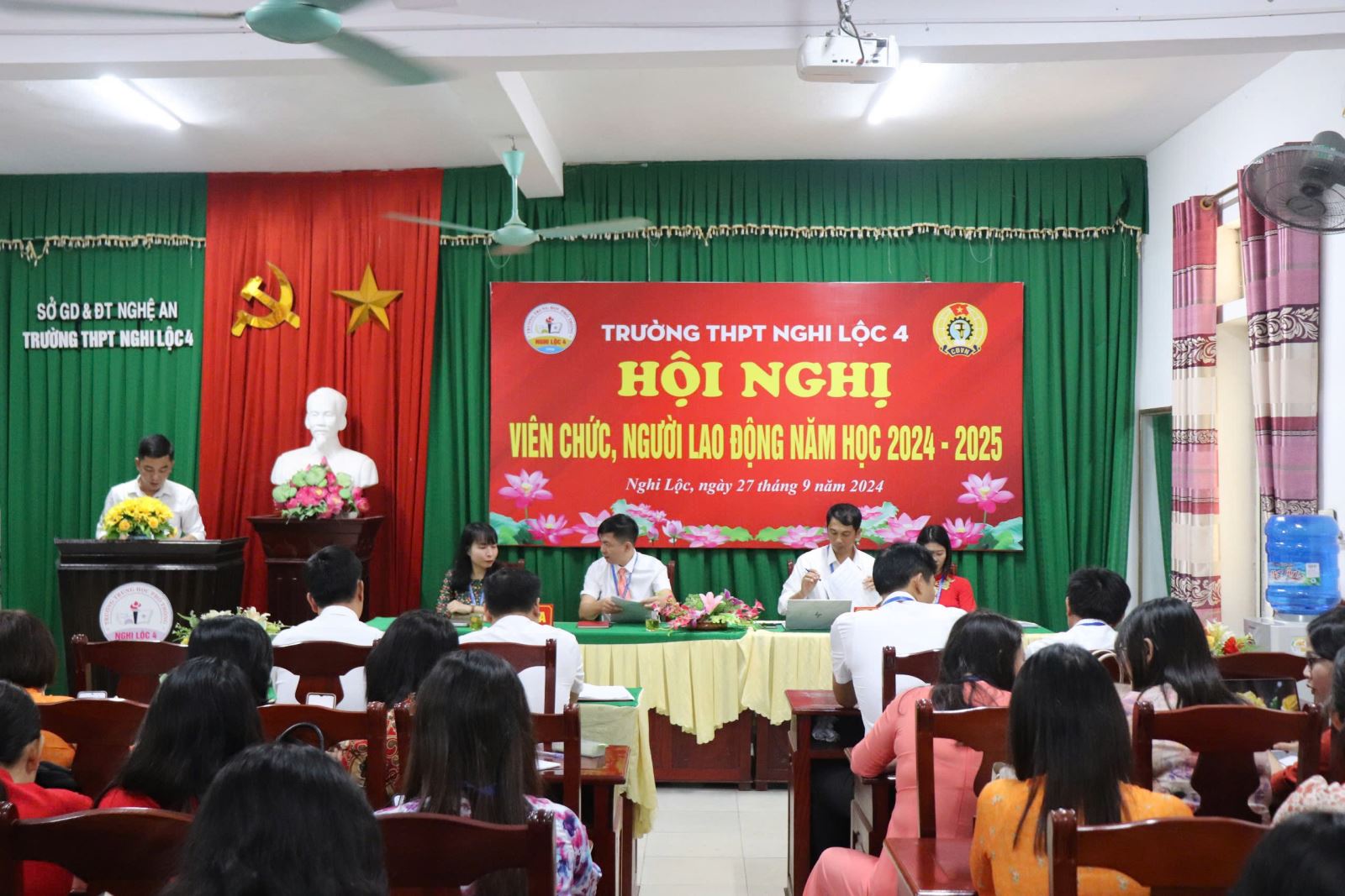 Thực hiện kế hoạch năm học 2024-2025 và được sự đồng ý của cấp trên. Sáng ngày 27 tháng 9 năm 2024, Trường THPT Nghi Lộc 4 long trọng tổ chức “Hội Nghị viên chức, người lao động” năm học 2024-2025. Hội nghị đã thông qua dự thảo báo cáo kết quả hoạt động cơ quan năm 2023-2024, triển khai nhiệm vụ công tác năm 2024-2025; Báo cáo tổng kết phong trào thi đua; Báo cáo công khai tài chính; Báo cáo tổng kết hoạt động của Ban thanh tra nhân dân; Tổng hợp ý kiến đóng góp vào các quy chế; các đề xuất, kiến nghị của đoàn viên. Những ý kiến đóng góp đầy tâm huyết và trách nhiệm của các Thầy cô, chúng ta sẽ cùng nhau đoàn kết, cộng sự và nỗ lực cố gắng để hoàn thành tốt nhiệm vụ của năm học. Tại hội nghị đã bầu Ban Thanh tra nhân dân, nhiệm kỳ 2024- 2026. Hội nghị kêu gọi toàn thể viên chức, người lao động trong đơn vị chung sức, đồng lòng, phát huy thuận lợi, khắc phục khó khăn, phấn đấu hoàn thành và hoàn thành xuất sắc các chỉ tiêu, nhiệm vụ mà Hội nghị đã đề ra, góp phần xây dựng Trường THPT Nghi Lộc 4 ngày càng lớn mạnh.