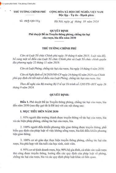 Với mục tiêu đến năm 2030 đạt 95% người trưởng thành được truyền thông về tác hại của rượu, bia và các biện pháp phòng, chống tác hại của rượu, bia, ngày 11/10/2024, Phó Thủ tướng Chính phủ đã ký Quyết định số 1169/QĐ-TTg phê duyệt Đề án Truyền thông phòng, chống tác hại của rượu, bia đến năm 2030.