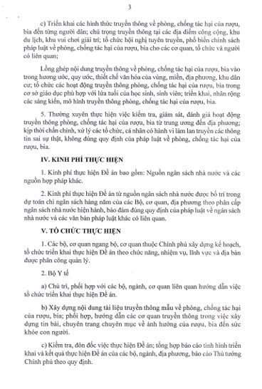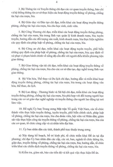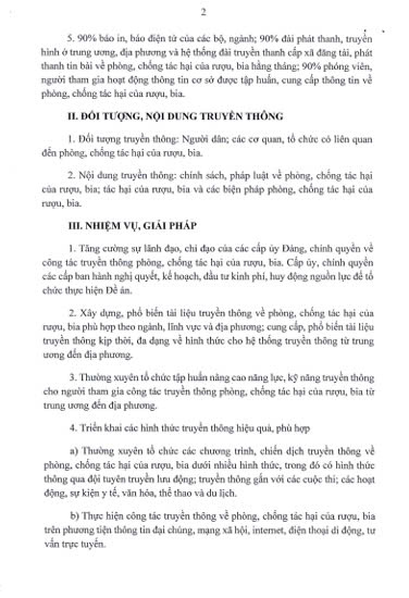 - Tăng cường sự lãnh đạo, chỉ đạo của các cấp ủy Đảng, chính quyền về công tác truyền thông phòng, chống tác hại của rượu, bia. Cấp ủy, chính quyền các cấp ban hành nghị quyết, kế hoạch, đầu tư kinh phí, huy động nguồn lực để tổ chức thực hiện Đề án.