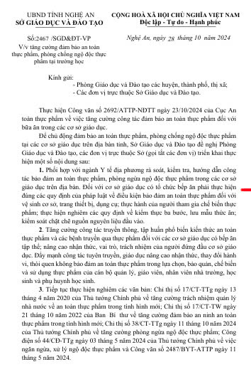 Thực hiện công văn số 2467/SGD&ĐT-VP ngày 28/10/2024 của sở GD&ĐT Nghệ An về việc tăng cường đảm bảo an toàn thực phẩm, phòng chống ngộ độc thực phẩm tại trường học. Để chủ động phòng chống ngộ độc thực phẩm và phòng tránh việc sử dụng thực phẩm không đảm bảo an toàn xảy ra trong và ngoài trường, nhà trường triển khai một số nội dung sau: