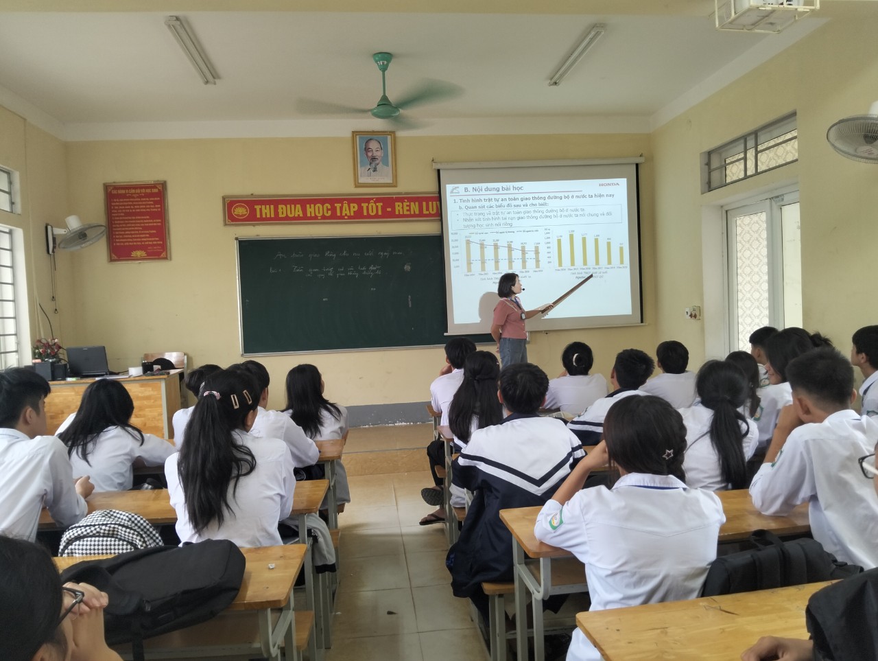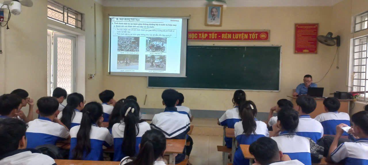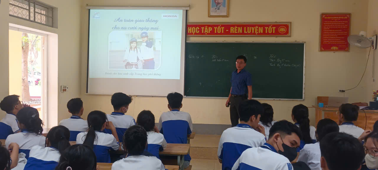 Sáng ngày 12 tháng 10 năm 2024 Ban ATGT nhà trường đã tổ chức triển khai giảng dạy tài liệu giáo dục "An toàn giao thông cho nụ cười ngày mai" dành cho học sinh cấp THPT, năm học 2024-2025 cho 36 lớp với chủ đề: Tầm quan trọng của việc tuân thủ các quy tắc giao thông đường bộ.