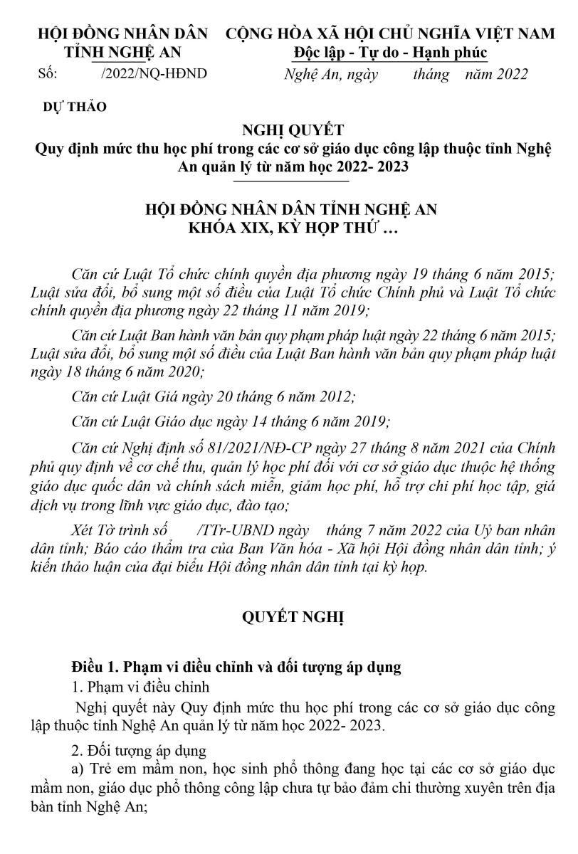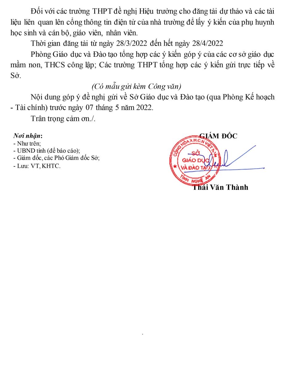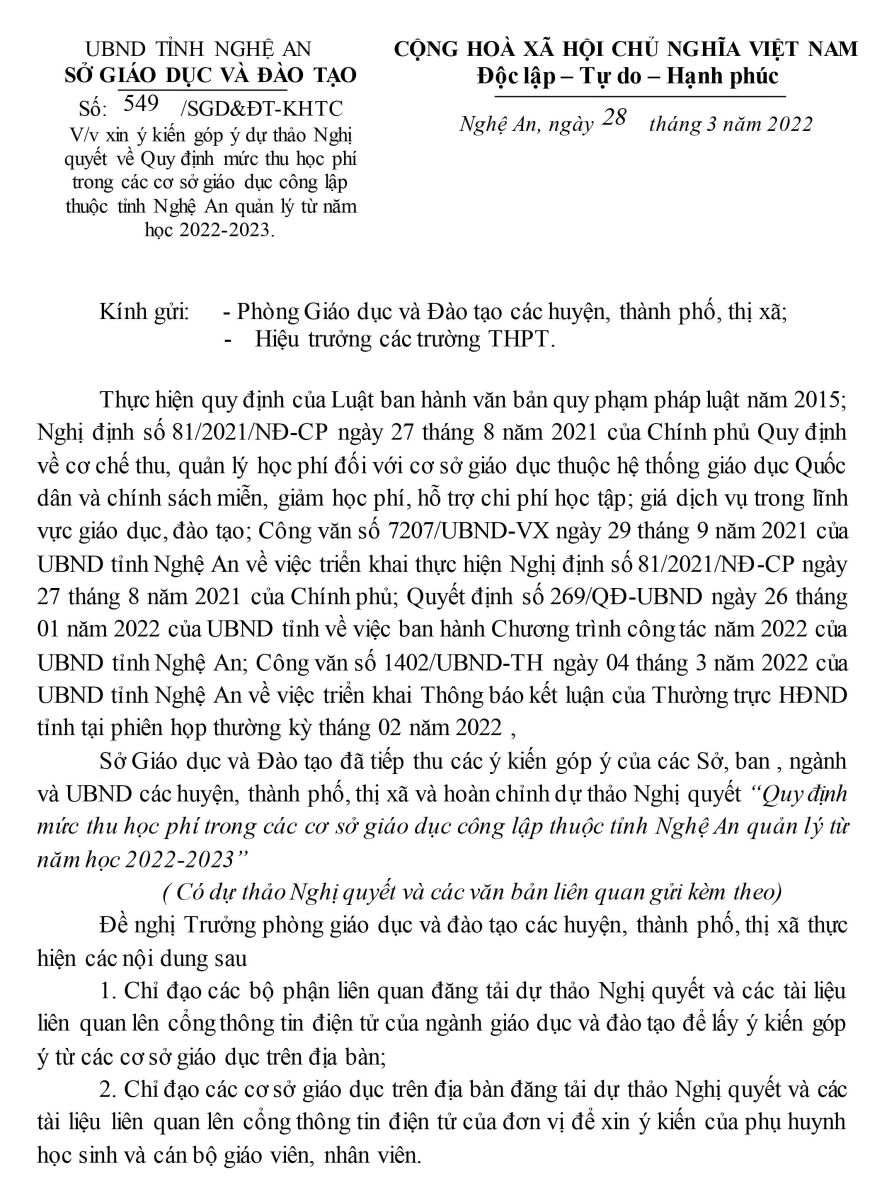 Ngày 28 tháng 3 năm 2022, Sở GD&ĐT Nghệ an đã có công văn số 549 về việc lấy ý kiến đóng góp cho dự thảo NQ về Quy định mức thu Học phí Công lập từ năm học 2022-2023. Vậy nhà trường đăng tải nội dung, mọi ý kiến góp ý xin gửi về Phòng Kế hoạch tài chính trước ngày 7/5/2022