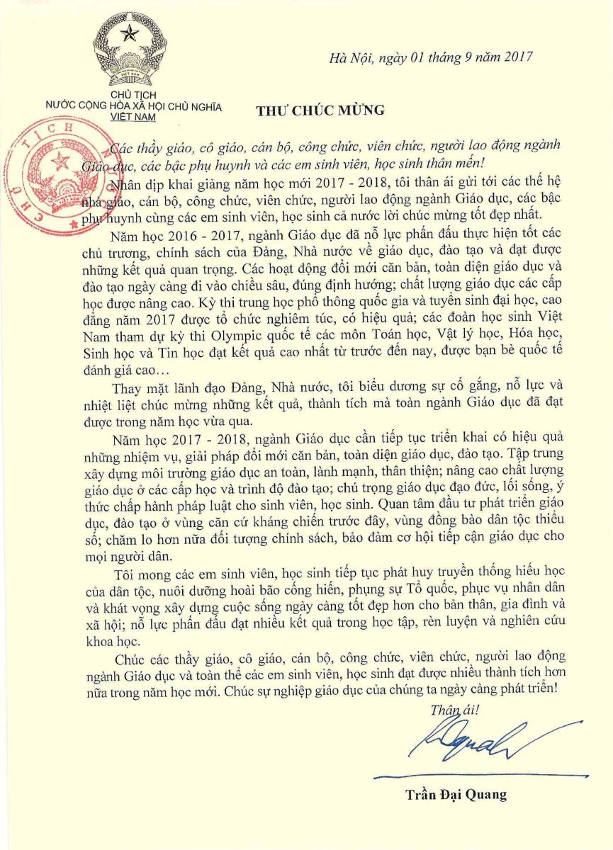 Thư của chủ tịch nước nhân ngày khai giảng