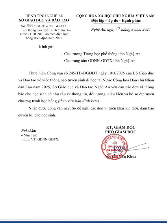 Tuyển sinh đi học tại nước CHDCND Lào theo diện học bổng Hiệp định năm 2025